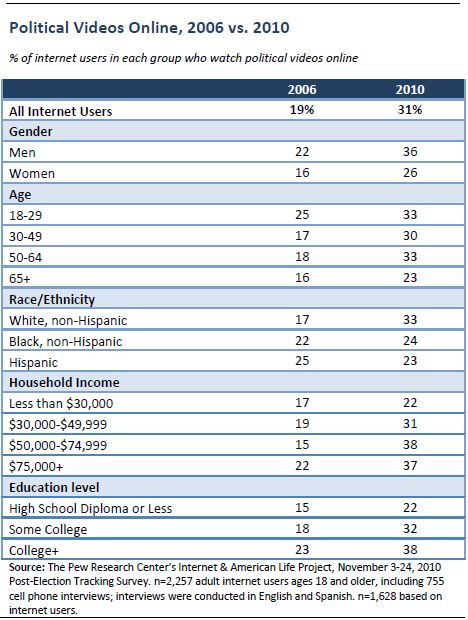 In the months leading up to the November elections, 31% of adult internet users went online the watch videos about the candidates or the campaign. This represents a 63% increase from the 19% of online adults who watched political videos in the previous off-year elections in 2006.