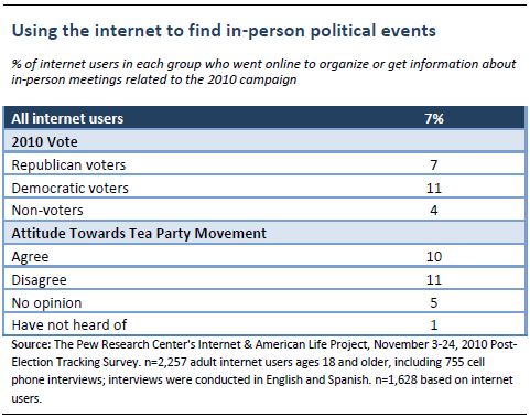 Seven percent of adult internet users went online to organize or get information about in-person meetings related to the campaign. There are relatively few demographic differences in this question, although college graduates (12% of such internet users did this in 2010) were more likely to go online for information about in-person political activities than were those with lower levels of education (5% of whom did so). Not surprisingly, those with relatively strong political leanings were more likely than others to go online to find out about offline political events.