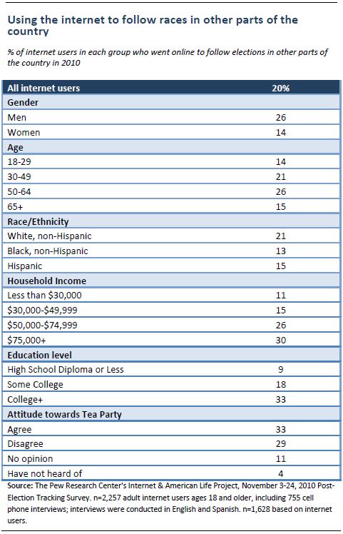 Thus, although the 2010 campaign was not a national election, fully 20% of adult internet users said that they went online in the months leading up to the election to follow an interesting election campaign in another part of the country. Men, whites, the relatively affluent and well-educated and those with strong views (either for or against) the Tea Party movement were particularly likely to go online to follow an election campaign elsewhere in the country in 2010.