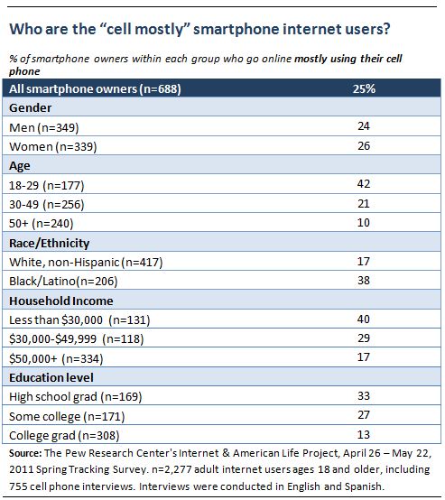 One-quarter of smartphone owners mostly go online using their cell phone, even though many have other access options available to them
