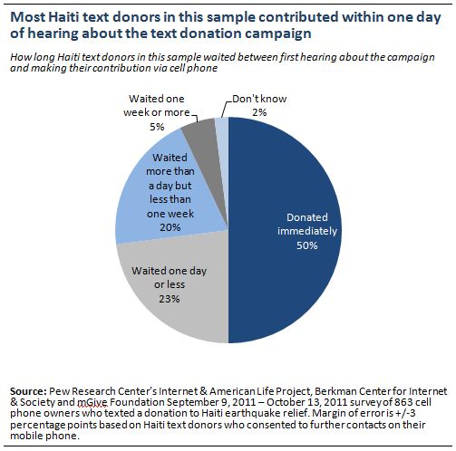 When asked how long they waited between first hearing about the text donation campaign for Haiti and actually donating, half of the Haiti mobile donors surveyed (50%) say that they donated immediately upon hearing about the effort. An additional 23% did not donate immediately, but did do so within a day—meaning that three-quarters of these donors made a contribution on the same day they first heard about the campaign. One in five (20%) waited between one day and one week before making a contribution, while a small number (5%) waited a week or more to donate.