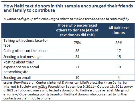 Just under half (43%) of the Haiti text donors surveyed indicate that they encouraged friends or family members to make a similar contribution using their mobile phones (56% did not do this). Demographically, young adult and non-white donors were more likely than others to encourage friends or family members to make a text donation—just over half of black (53%), Latino (55%) and 18-29 year old (54%) text donors in this sample did so.