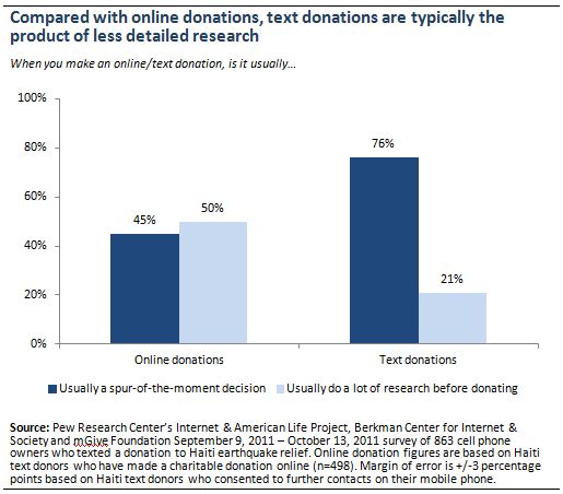 This tendency towards “impulse giving” via text message extends not just to their contribution to Haiti relief, but to their views of mobile giving more generally. In our survey we asked these donors whether their online and text message contributions to various organizations are usually a spur-of-the-moment decision, or whether they usually do a lot of research before making their contribution. For online donations, responses were split evenly—45% say that these contributions are usually spur-of-the-moment, while 50% say that they tend to research their decision beforehand. For text donations on the other hand, quick decisions are the norm—fully 76% say that these contributions usually involve minimal research.