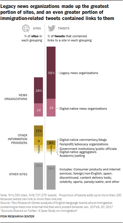 A large majority, 75%, of the more than 9 million immigration-related tweets that met the threshold contained links to sites in the News Organizations category.7 And a majority, 56%, of all immigration-related tweets contained links to legacy news organizations, while about one-in-five (19%) contained links to digital-native news organizations.