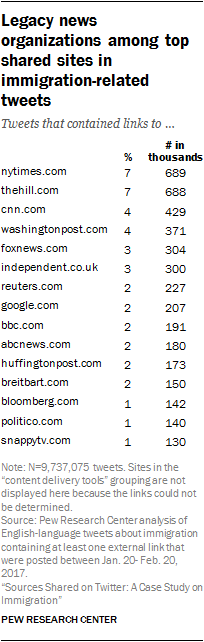 The 1,030 sites linked to most in tweets about immigration can also be viewed through a different lens: the number of tweets that contained a link to each site. In other words, while the main analysis gives all 1,030 sites equal weight, some were linked to by far more than the threshold of 750 tweets, while others were closer to that cutoff. Looking at the frequency of tweets that contained links to each site, then, identifies which sites in this mix – and thereby which groupings and categories – were the most prominent on Twitter in this discussion.