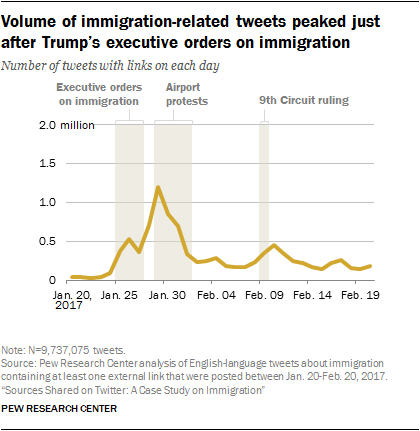 The daily rate of tweets posted about immigration during the period studied often mirrored current events. The highest volume of immigration-related tweets occurred in the days after President Trump signed several executive orders on immigration (particularly the executive order restricted entry to the U.S. by people from certain countries signed on Jan. 27, 2017) when protests took place at airports across the country. Tweets posted during this time (between Jan. 28-31) accounted for 36% of all tweets in this study. Following the protests, Twitter activity returned to lower rates but spiked again from Feb. 9-10, when 8% of all tweets in this study were posted, in the days after the 9th U.S. Circuit Court of Appeals affirmed a lower court’s decision to temporarily enjoin enforcement of the executive order.