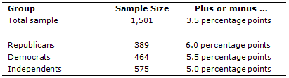 The combined landline and cell phone sample are weighted using an iterative technique that matches gender, age, education, race, Hispanic origin, region, and population density to parameters from the March 2010 Census Bureau’s Current Population Survey. The sample also is weighted to match current patterns of telephone status and relative usage of landline and cell phones (for those with both), based on extrapolations from the 2010 National Health Interview Survey. The weighting procedure also accounts for the fact that respondents with both landline and cell phones have a greater probability of being included in the combined sample and adjusts for household size within the landline sample. Sampling errors and statistical tests of significance take into account the effect of weighting. The following table shows the sample sizes and the error attributable to sampling that would be expected at the 95% level of confidence for different groups in the survey: