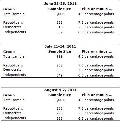 Most of the analysis in this report is based on telephone interviews conducted July 20-24, 2011 among a national sample of 1,501 adults 18 years of age or older living in the continental United States (916 respondents were interviewed on a landline telephone, and 585 were interviewed on a cell phone, including 254 who had no landline telephone). The survey was conducted by interviewers at Princeton Data Source under the direction of Princeton Survey Research Associates International. A combination of landline and cell phone random digit dial samples were used; both samples were provided by Survey Sampling International. Interviews were conducted in English and Spanish. Respondents in the landline sample were selected by randomly asking for the youngest adult male or female who is now at home. Interviews in the cell sample were conducted with the person who answered the phone, if that person was an adult 18 years of age or older. For detailed information about our survey methodology, see https://beta.pewresearch.org/pewresearch-org/politics/methodology/