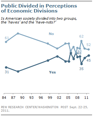The percentage of Americans who see society as divided between haves and have-nots declined shortly after Barack Obama took office, but has rebounded since. In April 2009, just 35% said the nation was divided economically, down from 44% in October 2008. The number saying the nation is economically divided increased to 42% a year later and has changed little since then (45% currently).