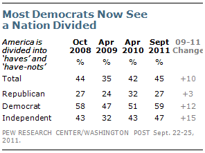 Since 2009, the percentage of independents saying the country is divided between haves and have-nots has risen 15 points, from 32% to 47%. There has been a comparable increase in the proportion of Democrats expressing this view (from 47% to 59%). Just 27% of Republicans see the nation as economically divided, which is largely unchanged from two years ago (24%).