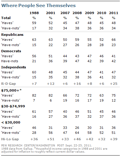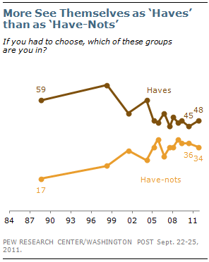 The latest survey by the Pew Research Center for the People & the Press and The Washington Post, conducted Sept. 22-25 among 1,000 adults, finds that 48% say that, if forced to choose, they are among the haves, while 34% say they are among the have-nots. This balance of opinion has changed little over the past six years. Over the longer term, however, the number seeing themselves in the have-nots has risen substantially. In 1988, half as many described themselves this way (17%) as is the case today (34%).