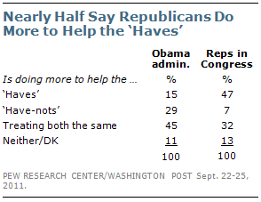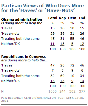 Interestingly, partisan differences are relatively modest in views of which groups the Obama administration is doing more to help. More Republicans, Democrats and independents say the administration is doing more to help the have-nots than the haves. By contrast, 72% of Democrats say the GOP mostly helps the haves, compared with 46% of independents and just 20% of Republicans.