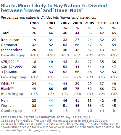 There long have been wide racial differences in views of whether the nation is economically divided. In the current survey, 73% of African Americans say the nation is divided between haves and have-nots, compared with 40% of whites.