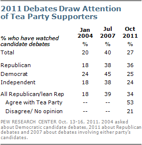 And, in a sign of their engagement this election cycle, about half of Republicans and Republican-leaning independents who say they agree with the Tea Party say they have watched any of the GOP debates (53%). This compares with only 21% among Republicans and Republican-leaners who do not identify with the Tea Party movement.