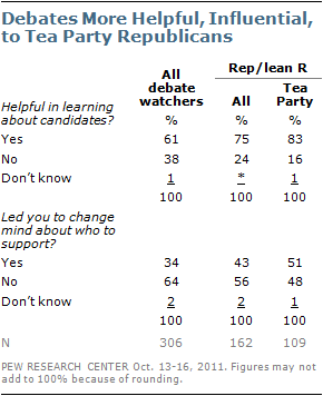 Three quarters of Republicans and Republican-leaning viewers say they have found the debates to be helpful in learning about the candidates (75%). Among those who say they agree with the Tea Party, 83% say the debates have been helpful.
