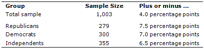 The combined landline and cell phone sample are weighted using an iterative technique that matches gender, age, education, race, Hispanic origin, region, and population density to parameters from the March 2010 Census Bureau’s Current Population Survey. The sample is also weighted to match current patterns of telephone status based on extrapolations from the 2010 National Health Interview Survey. The weighting procedure also accounts for the fact that respondents with both landline and cell phones have a greater probability of being included in the combined sample and adjusts for household size within the landline sample. Sampling errors and statistical tests of significance take into account the effect of weighting. The following table shows the sample sizes and the error attributable to sampling that would be expected at the 95% level of confidence for different groups in the survey: