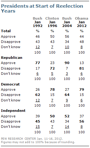 George W. Bush began his reelection year with a 56% job approval rating; Bill Clinton’s approval rating was 50% in January 1996. Obama’s current mark is closer to George H. W. Bush’s in January 1992 (46% approved, 43% disapproved).