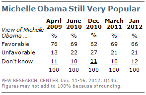 The survey also finds that Michelle Obama remains broadly popular with the public. Currently 66% say they have a favorable opinion of Michelle Obama while just 21% have an unfavorable view. Favorable opinions of the first lady have declined only modestly – by 10 points – since peaking at 76% early in her first year in the White House. In contrast, Barack Obama’s personal favorability has fallen by 22 points (from 73% to 51%) during this period.