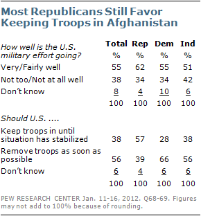 The public also continues to say the effort in Afghanistan is going at least fairly well (55%), with Republicans (62%) and Democrats (55%) about equally likely to say it is going well. Independents offer less positive assessments (51% very or fairly well, 42% less well).