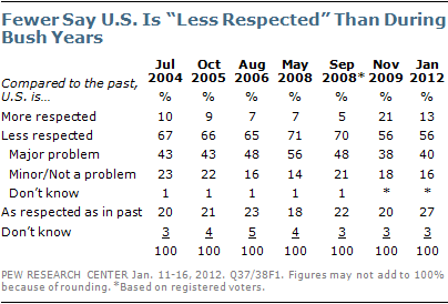 A 56% majority of Americans say the U.S. is less respected now than it was in the past. This is unchanged from November of 2009, and remains a more positive assessment of foreign impressions than throughout the later years of George W. Bush’s administration. At the same time, the percentage saying the U.S. is more respected than in the past has declined over the last two years (from 21% to 13%), with a comparable rise in the proportion saying the country is as respected as it had been (from 20% to 27%).