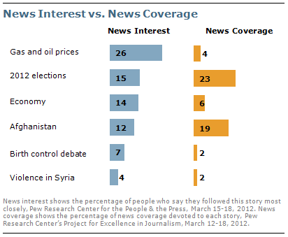 Despite the strong interest, news about rising fuel prices made up a modest 4% of the week’s coverage analyzed by the Pew Research Center’s Project for Excellence in Journalism. More general economic stories accounted for 6% of coverage, but the week’s top stories were the 2012 elections (23% of coverage) and the situation in Afghanistan (19%).