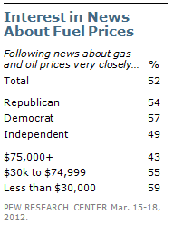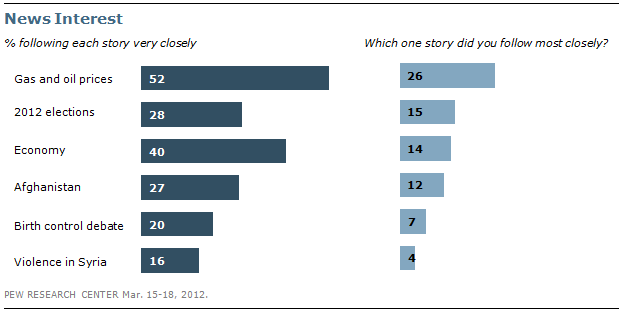 About a quarter (26%) say they followed news about rising gas and oil prices more closely than any other story, according to the latest weekly News Interest Index survey, conducted March 15-18 among 1,009 adults by the Pew Research Center for the People & the Press.