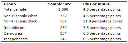 The combined landline and cell phone sample are weighted using an iterative technique that matches gender, age, education, race, Hispanic origin and region to parameters from the March 2011 Census Bureau’s Current Population Survey and population density to parameters from the Decennial Census. The sample is also weighted to match current patterns of telephone status based on extrapolations from the 2011 National Health Interview Survey. The weighting procedure also accounts for the fact that respondents with both landline and cell phones have a greater probability of being included in the combined sample and adjusts for household size within the landline sample. Sampling errors and statistical tests of significance take into account the effect of weighting. The following table shows the sample sizes and the error attributable to sampling that would be expected at the 95% level of confidence for different groups in the survey: