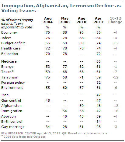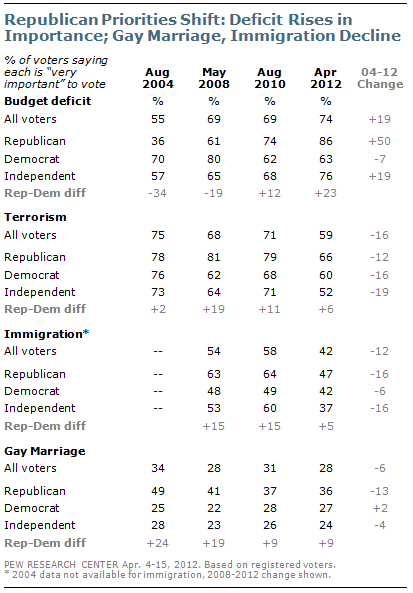 Immigration and gay marriage have slipped as voting priorities among Republican voters. About half of Republican voters (47%) say the issue of immigration will be very important to their vote; in 2010, 64% rated immigration as very important and in 2008 63% did so. Immigration also has fallen in importance among independents. Only about four-in-ten (37%) independent voters now view the issue as very important, down 23 points from August 2010. The percentage 0f GOP voters viewing gay marriage as very important has fallen 13 points, from 49% to 36%, since August 2004. There has been far less change in opinions among Democrats and independents, who have consistently rated this lower in importance than have Republicans.