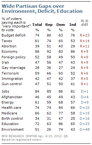 Overwhelming percentages of Republicans, Democrats and independents rate the economy and jobs as very important voting issues. However, there are substantial partisan differences over the importance of other issues – including the environment, the