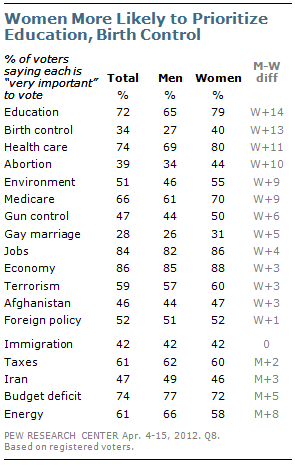 There are several issues, including education, birth control, health care and abortion, that rate as more important for women than men. Nearly eight-in-ten women (79%) say that education will be very important to their vote this fall, compared with 65% of men.