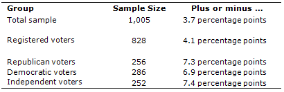 The combined landline and cell phone sample are weighted using an iterative technique that matches gender, age, education, race, Hispanic origin and region to parameters from the March 2011 Census Bureau’s Current Population Survey and population density to parameters from the Decennial Census. The sample also is weighted to match current patterns of telephone status, based on extrapolations from the 2011 National Health Interview Survey. The weighting procedure also accounts for the fact that respondents with both landline and cell phones have a greater probability of being included in the combined sample and adjusts for household size among respondents with a landline phone. Sampling errors and statistical tests of significance take into account the effect of weighting. The following table shows the sample sizes and the error attributable to sampling that would be expected at the 95% level of confidence for different groups in the survey: