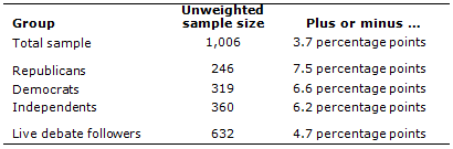 The analysis in this report is based on telephone interviews conducted October 4-7, 2012 among a national sample of 1,006 adults 18 years of age or older living in the continental United States (601 respondents were interviewed on a landline telephone, and 405 were interviewed on a cell phone, including 206 who had no landline telephone). The survey was conducted under the direction of Princeton Survey Research Associates International. A combination of landline and cell phone random digit dial samples were used; both samples were provided by Survey Sampling International. Interviews were conducted in English. Respondents in the landline sample were selected by randomly asking for the youngest adult male or female who is now at home. Interviews in the cell sample were conducted with the person who answered the phone, if that person was an adult 18 years of age or older. For detailed information about our survey methodology, see: https://beta.pewresearch.org/pewresearch-org/politics/methodology/.