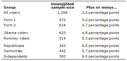 The weighting was accomplished in multiple stages. The first stage used the respondents’ final weight from the original survey to correct for any biases in that survey. In the second stage, the sample was weighted using an iterative technique that matches gender, age, education, race, Hispanic origin and nativity and region to targets for all registered voters eligible for re-contact from the original survey. This step helps to minimize bias that could occur because certain types of respondents may have been easier or more difficult to re-interview. In addition, the sample was weighted to reflect the margin of the 2012 election results (an approximately 3-point Obama advantage over Romney). Sampling errors and statistical tests of significance take into account the effect of weighting. The following table shows the unweighted sample sizes and the error attributable to sampling that would be expected at the 95% level of confidence for different groups of voters in the survey:
