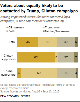 Of those who have been contacted on behalf of one of the presidential candidate a third of all registered voters have been contacted only in support of Clinton (35%) and about as many have received contact from only the Trump campaign or supporters (30%); an additional 30% say they have been contacted in some form by both campaigns.