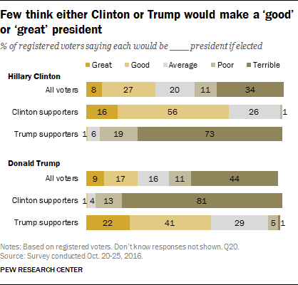 Clinton and Trump supporters have positive views of their candidates as potential presidents, but few think they will make great presidents. Just 16% of Clinton supporters say she would be a great president, while 56% say should be good and 26% think she would be average. Among Trump supporters, 22% say he would make a great president, 41% good and 29% average.
