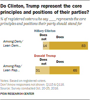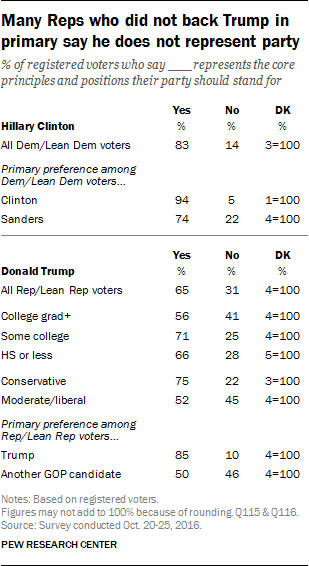 Primary support is strongly related to assessments about whether the candidates represent what their parties should stand for. In particular, among Republican voters many who did not back Trump for the GOP nomination say he does not represent the Party’s principles and positions.