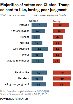 Nearly six-in-ten (59%) say Clinton is hard to like, while almost as many (56%) say she possesses poor judgment. Even greater shares describe Trump as hard to like (70%) and having poor judgment (65%).