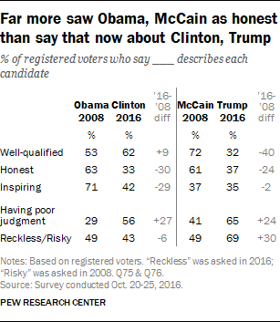 In October 2008, many more voters viewed both Barack Obama and John McCain as honest than say that about Clinton and Trump today.