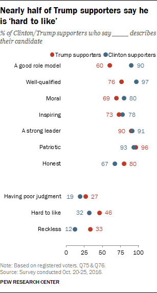 Nearly half of Trump’s supporters (46%) say he is hard to like, while a third describe him as reckless. Smaller shares of Clinton supporters say she is hard to like (32%) or reckless (12%).