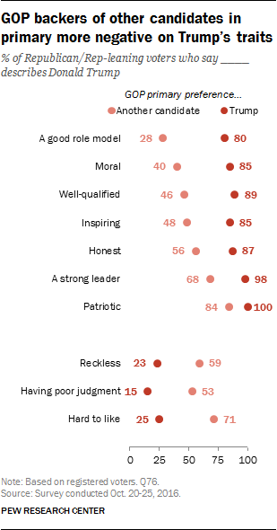 Republicans who supported him in the primaries are nearly three times as likely as those who supported another candidate (80% vs. 28%) to think of Trump as a good role model. And Trump primary supporters are roughly twice as likely as those who supported another primary candidate to think of Trump as well-qualified (89% vs. 46%) or as moral (85% vs. 40%).