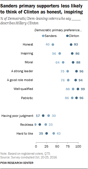 There are striking differences on certain characteristics of Clinton based on primary support as well. Just 40% of those who say they supported Bernie Sanders in the Democratic primary think of Clinton as honest, compared with more than twice as many (83%) of her primary supporters who say the same.