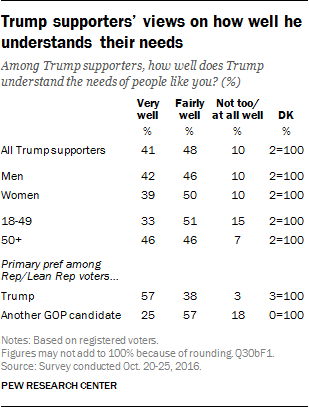 As is the case among Clinton supporters, supporters of Trump who are age 50 and older are more likely than those ages 18-49 to say he understands their needs very well (46% vs. 33%).