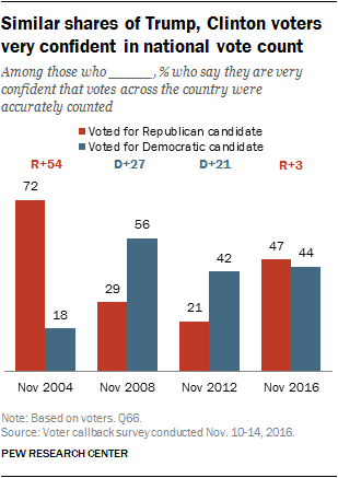 Those who voted for Donald Trump and Hillary Clinton are about equally likely to say they are very confident that votes across the country were accurately counted (47% vs. 44%). This stands in stark contrast to recent cycles, when those who voted for the winning candidate expressed significantly more confidence in the national vote count than those who voted for the losing candidate.