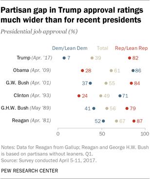 Less confidence in Trump in dealing with Congress. Donald Trump’s overall job rating stands at 39%, the same as it was in February. As was the case then, his job rating today is lower – and more politically divided – than other recent presidents at comparable points in their first year. For more, see detailed demographic tables on Trump job approval.