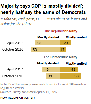 In the current survey, 57% of Republicans see their party as mostly divided, while a similar majority of Democrats (58%) say their party is mostly united.