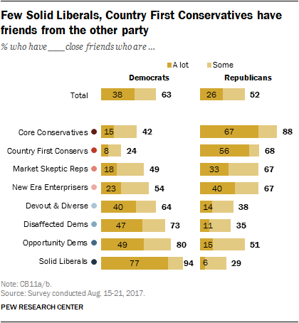 Roughly nine-in-ten Core Conservatives (88%) – who are near universally Republican or lean Republican – say they have at least some close Republican friends, while only 42% say they have at least some Democratic friends. The imbalance is even more pronounced among Country First Conservatives (68% to 24%) and Solid Liberals (94% say they have at least some Democratic friends, 29% at least some Republican friends).