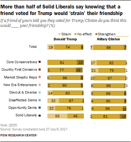 About one-in-five (19%) of both Core Conservatives and Country First Conservatives say a friend’s vote for Trump would strengthen their friendship, compared with smaller shares in other GOP-oriented groups. Roughly the same share of Solid Liberals (18%) say knowing a friend voted for Clinton would strengthen a friendship.