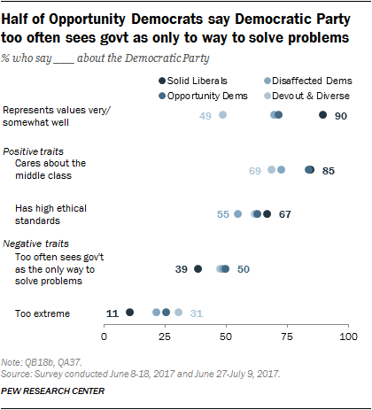 While the criticism that the GOP is too willing to cut government programs has little resonance among Core Conservatives, 39% of Solid Liberals say the Democratic Party “too often sees government as the only way to solve problems.”