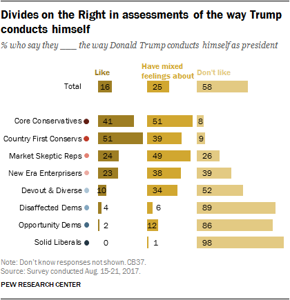 In general, just 16% of the public likes the way that Trump conducts himself as president, while an additional 25% say they have mixed feelings and 58% do not like his conduct.