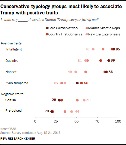 For example, though majorities of all four Republican groups say “intelligent” describes Donald Trump at least fairly well, about nine-in-ten Core Conservatives (95%) and Country First Conservatives (93%) say this, compared with 70% of New Era Enterprisers.
